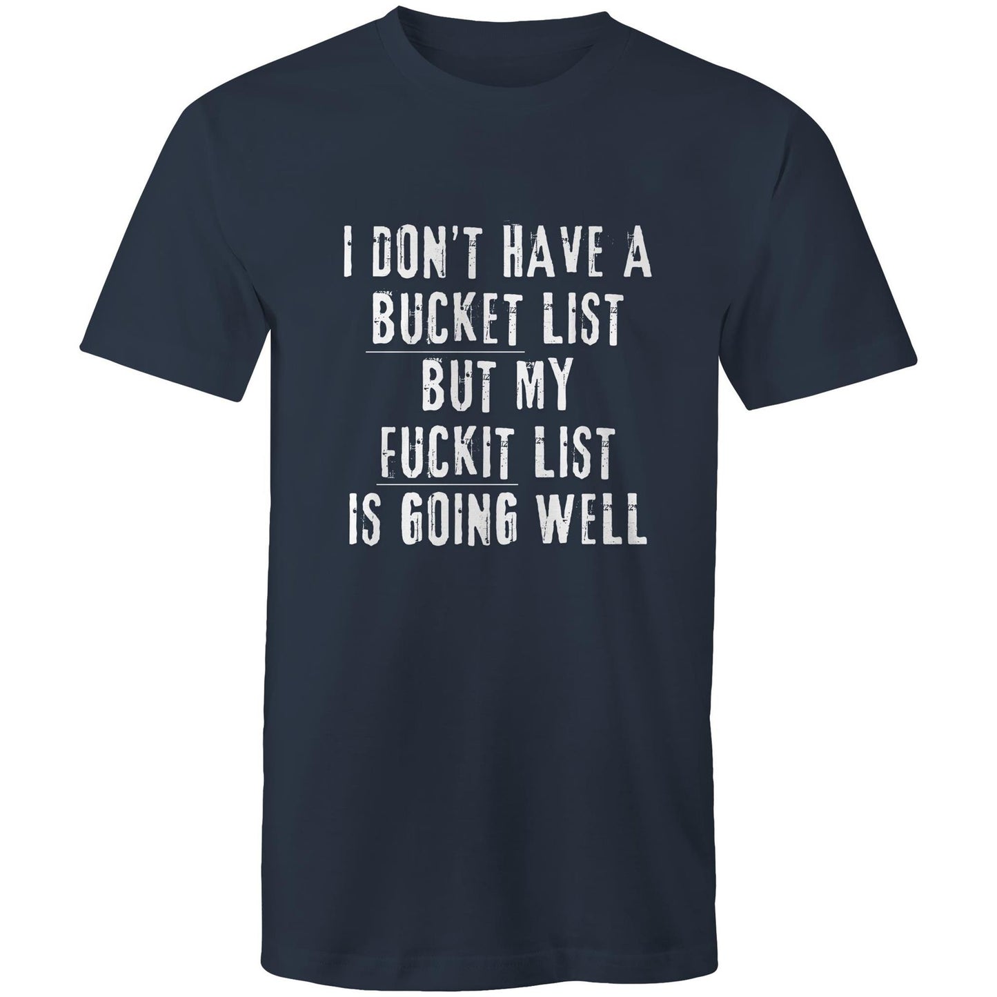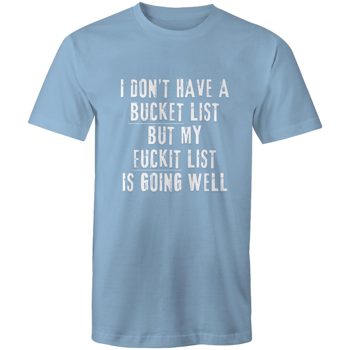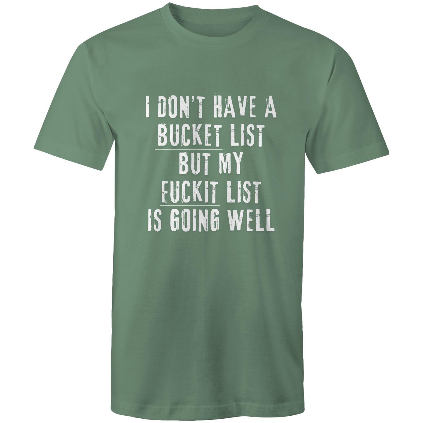 Unleash your inner rebel with our hilarious t-shirt design: 'I Don't Have a Bucket List, But My Fuckit List is Going Well.' Perfect for those who live life on the edge and have a knack for throwing caution to the wind. Wear it proudly and let the world know that you're embracing every moment with a healthy dose of humour and a carefree attitude. Get yours now and let your 'fuckit' spirit shine bright!